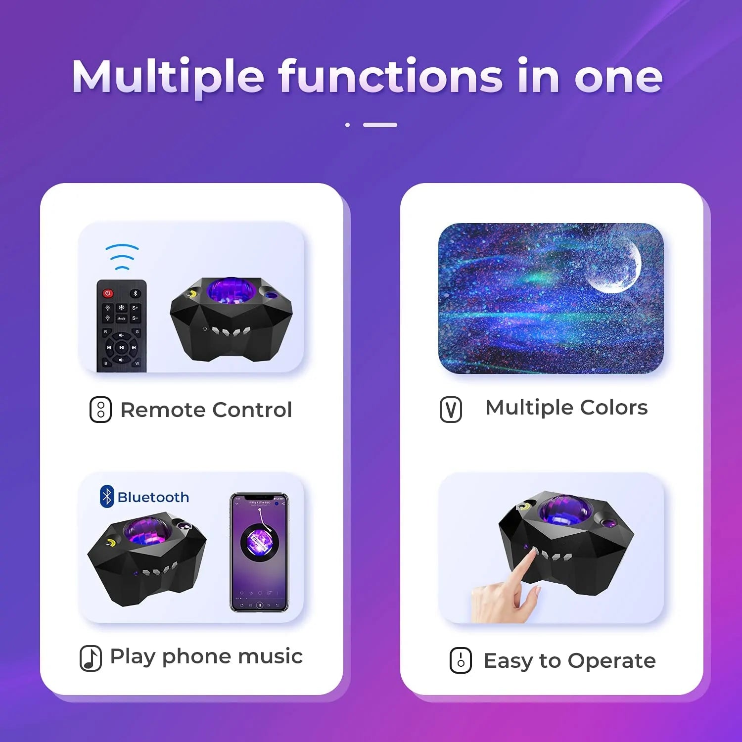 Galaxy Light Projector to create a romantic, gorgeous, and magical atmosphere and to light up the life for you, suitable for Bedroom,Game Rooms,Baby Room ,family and you friends,Mothers' Day, Birthday, Christmas Day, Halloween Day, Thanks Giving Day, etc. It creates a wonderful and starry atmosphere, helping children to stimulate curiosity, imagination, creativity.
